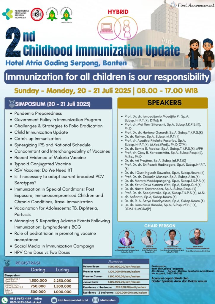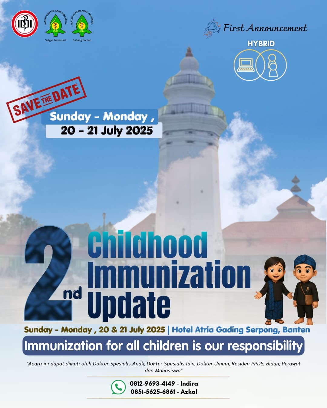 NEXT EVENT2nd ChildhoodImmunizationUpdateImmunization for all children is our responsibility Registration Event Sunday – Monday 20 & 21 July 2025 Whatsapp0812-9693-4149 (Indira)0851-5625-6861 (Azkal) Rundown Event Rundown EventDownload Detail Event IDAI Banten Immunization for all children is our responsibility